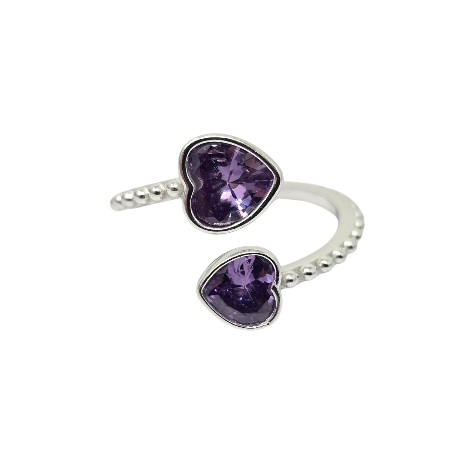 Double Heart Amethyst Heart February Birthstone Adjustable Silver Ring