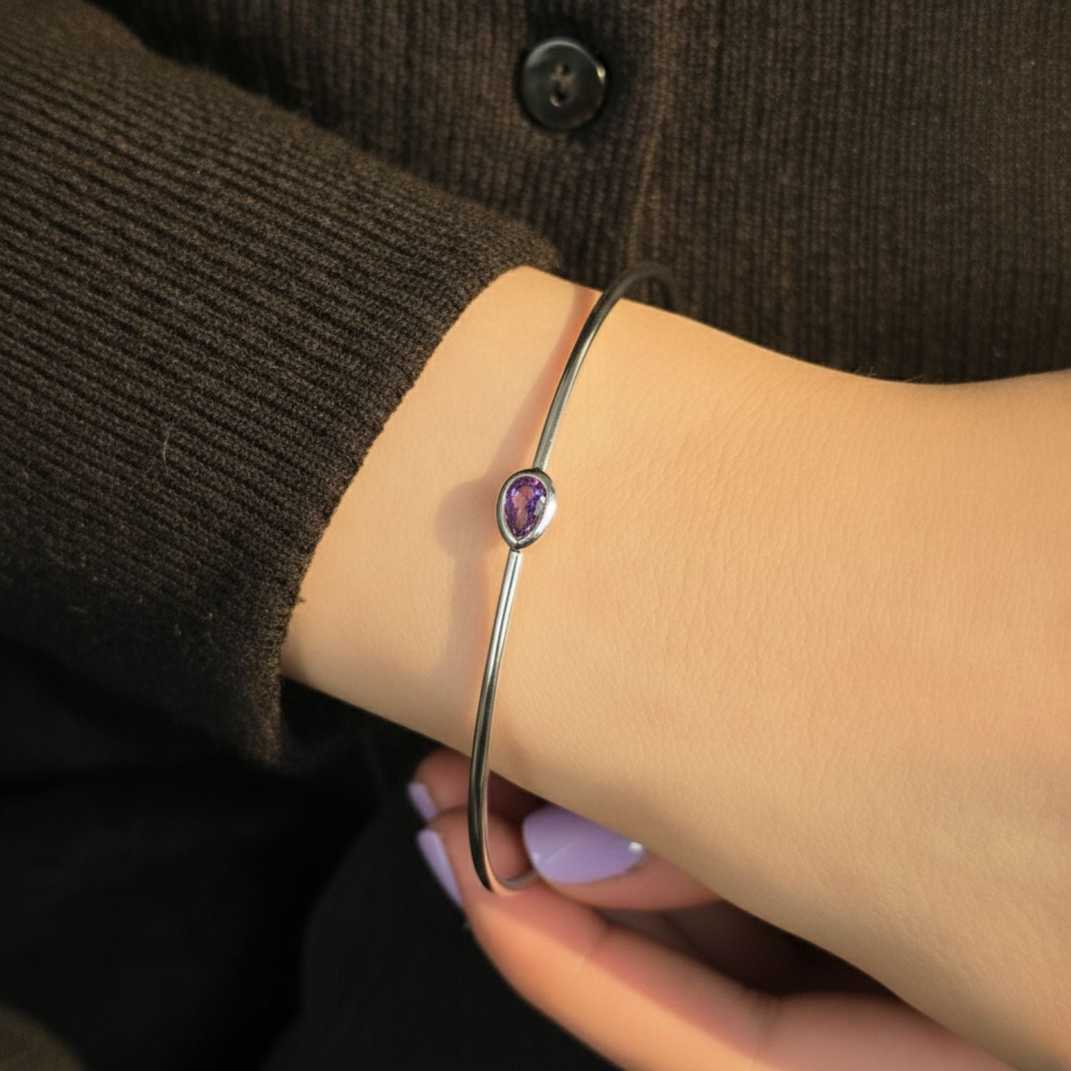 Minimalist Sterling Silver Amethyst February Birthstone Bangle Bracelet