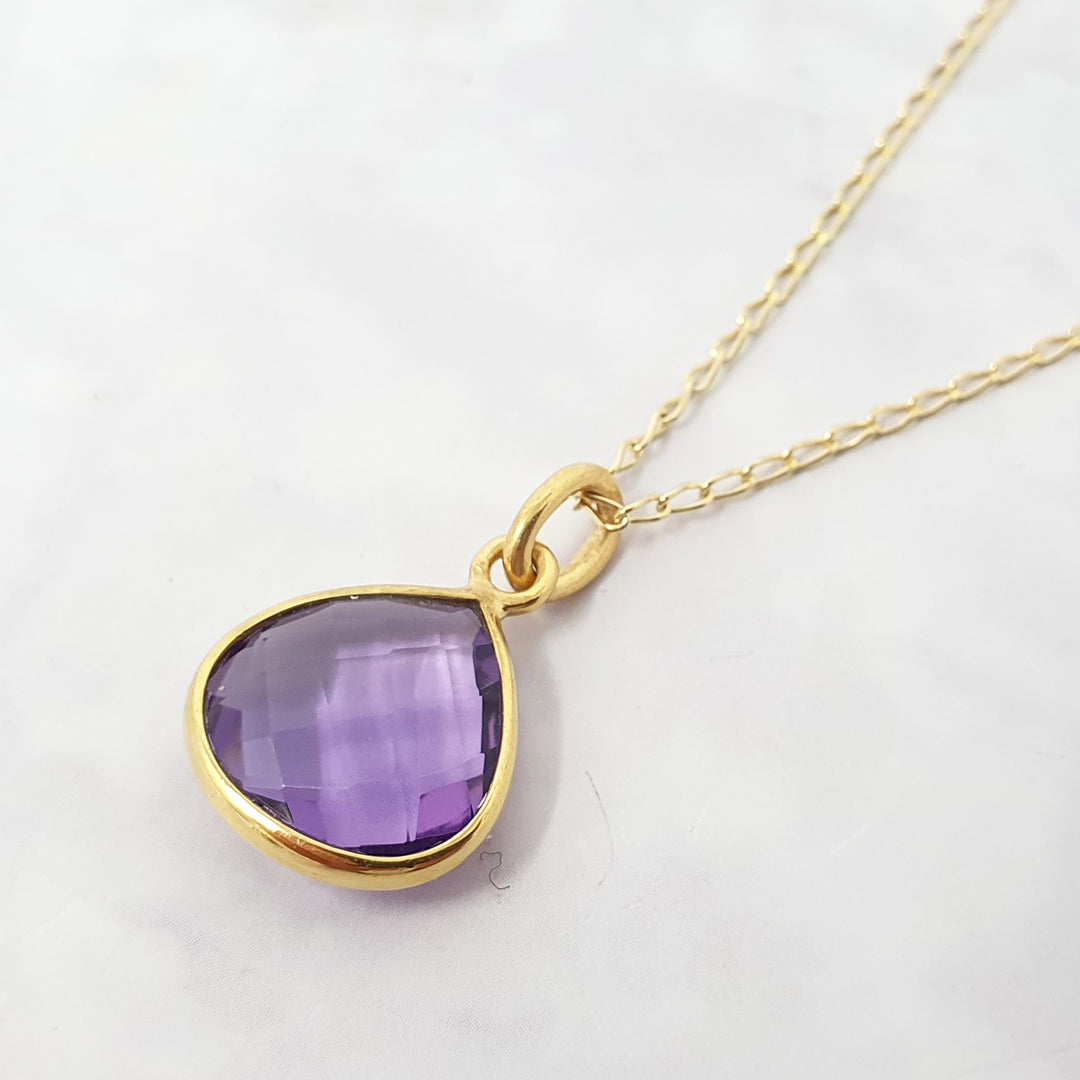 Celebrate February birthdays with timeless elegance wearing our Amethyst February Birthstone Gold Vermeil Charm Necklace, a radiant symbol of love and serenity.