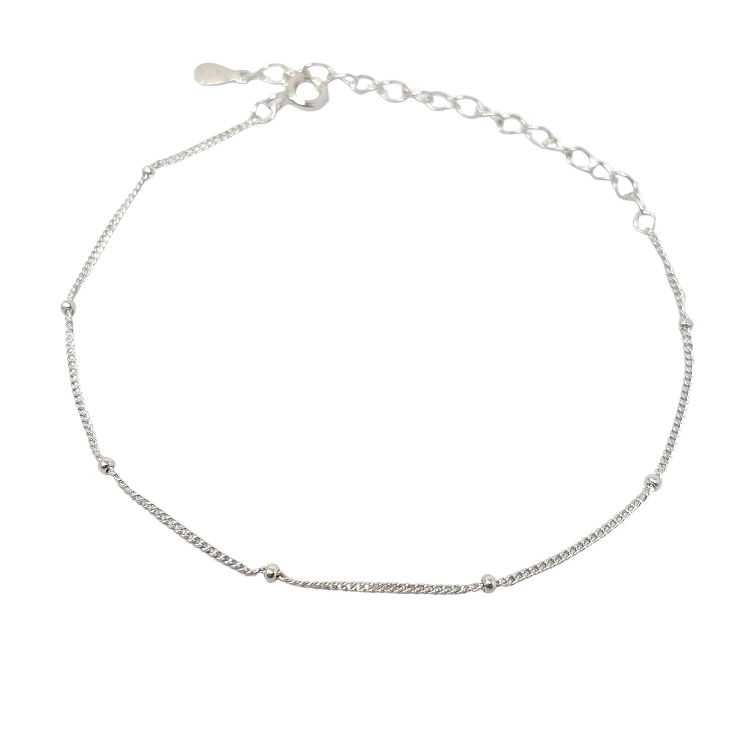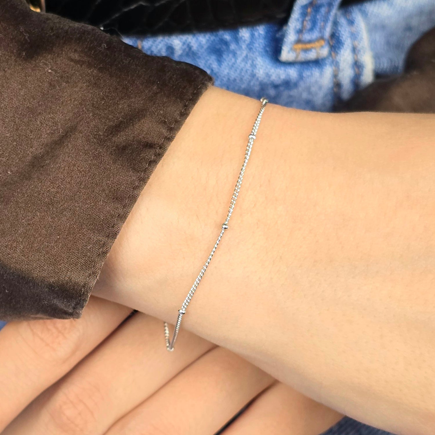 A delicate sterling silver satellite chain bracelet with rhodium plating, ideal for stacking or subtle everyday shine.