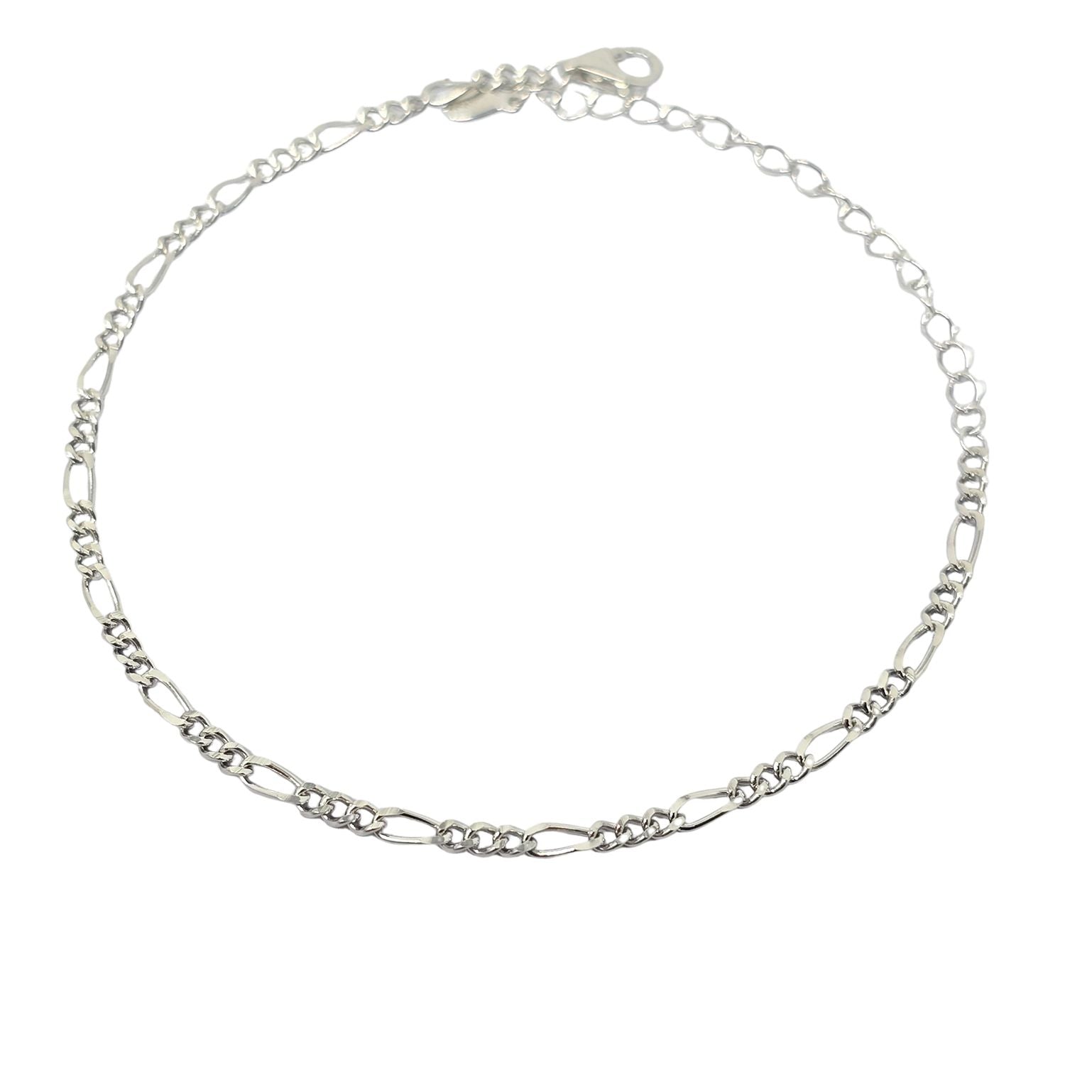 A classic sterling silver Figaro chain bracelet with rhodium plating, perfect for stacking or elegant solo wear.