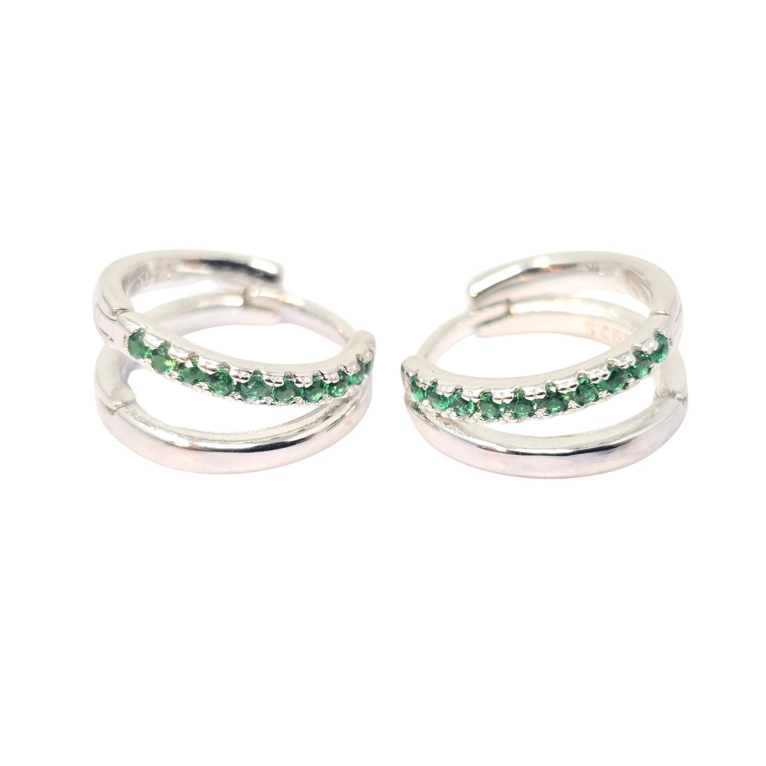 Emerald May Birthstone Double Hoop Small Huggie Sterling Silver Earrings