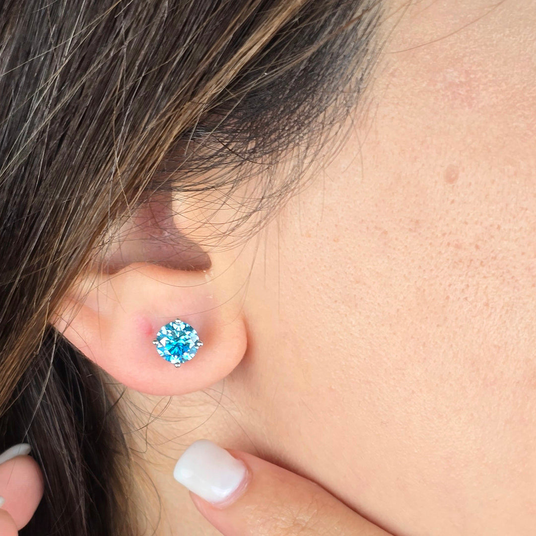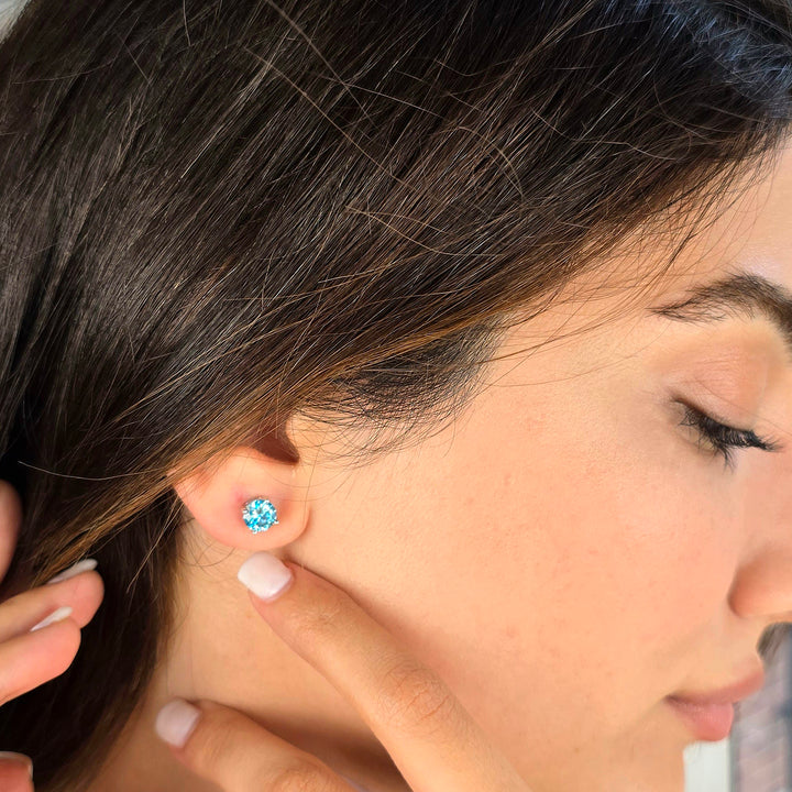 Each earring showcases a 6mm by 6mm certified aquamarine-colored moissanite stone, secured by classic butterfly backs for a comfortable and secure fit suitable for everyday wear.